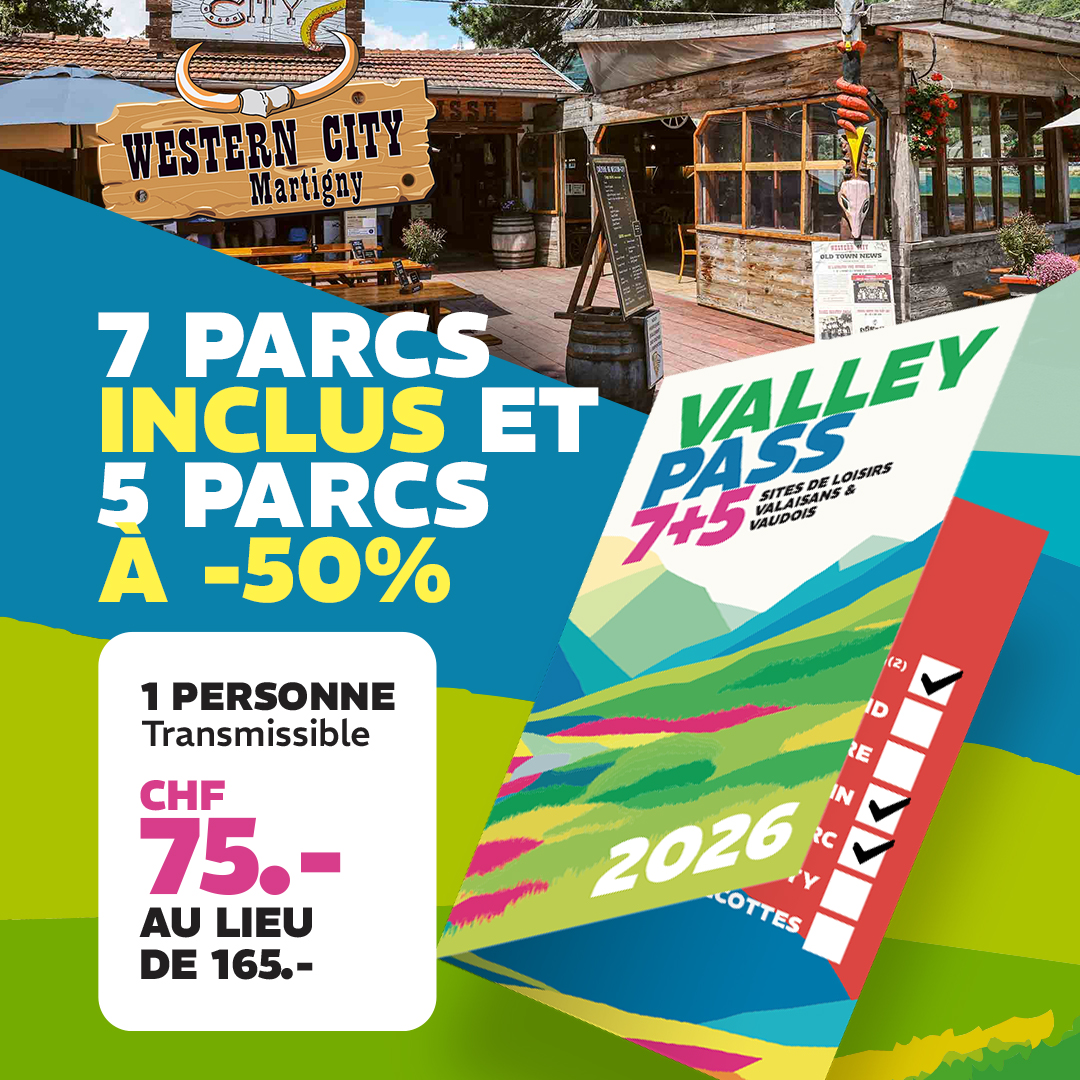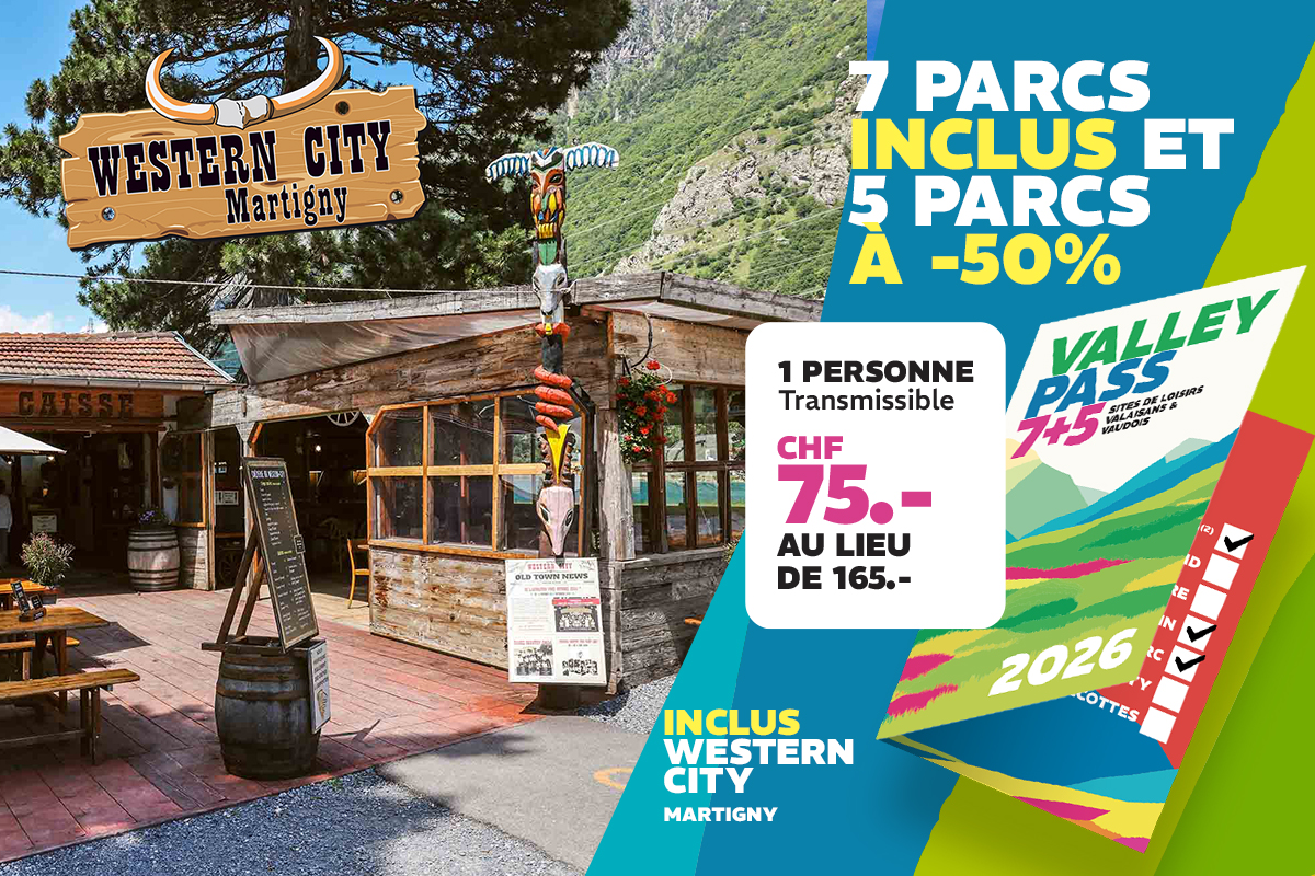BILLETTERIE Vos billets d’entrée, abonnements, carte cadeau, Festival Country. Parc fermé. Réouverture le jeudi 19 mars 2026. BILLET D’ENTRÉE Gratuit avant 3 ans.Les enfants payent l’entrée dès 3 ans révolus. ACHETER CARTE CADEAU De CHF 15 à 200.-Valable pour l’entrée et/ou buvette restauration. ACHETER ABONNEMENT Valable pour 1 an à partir de la date d’achat.L’abonnement est nominatif et non transmissible. ACHETER WESTERN DANCE DAY 2026 Crazy Pug en concert Live ! Samedi 9 mai 2026 à 13h ACHETER Restoroute de MartignyDomaine du Rosel1920 Martigny+41 27 764 16 52info@western-city.ch Page d’accueil Billetterie Les activités La crêperie Danse Country Western Dance Day Anniversaire Groupe Infos & Contact